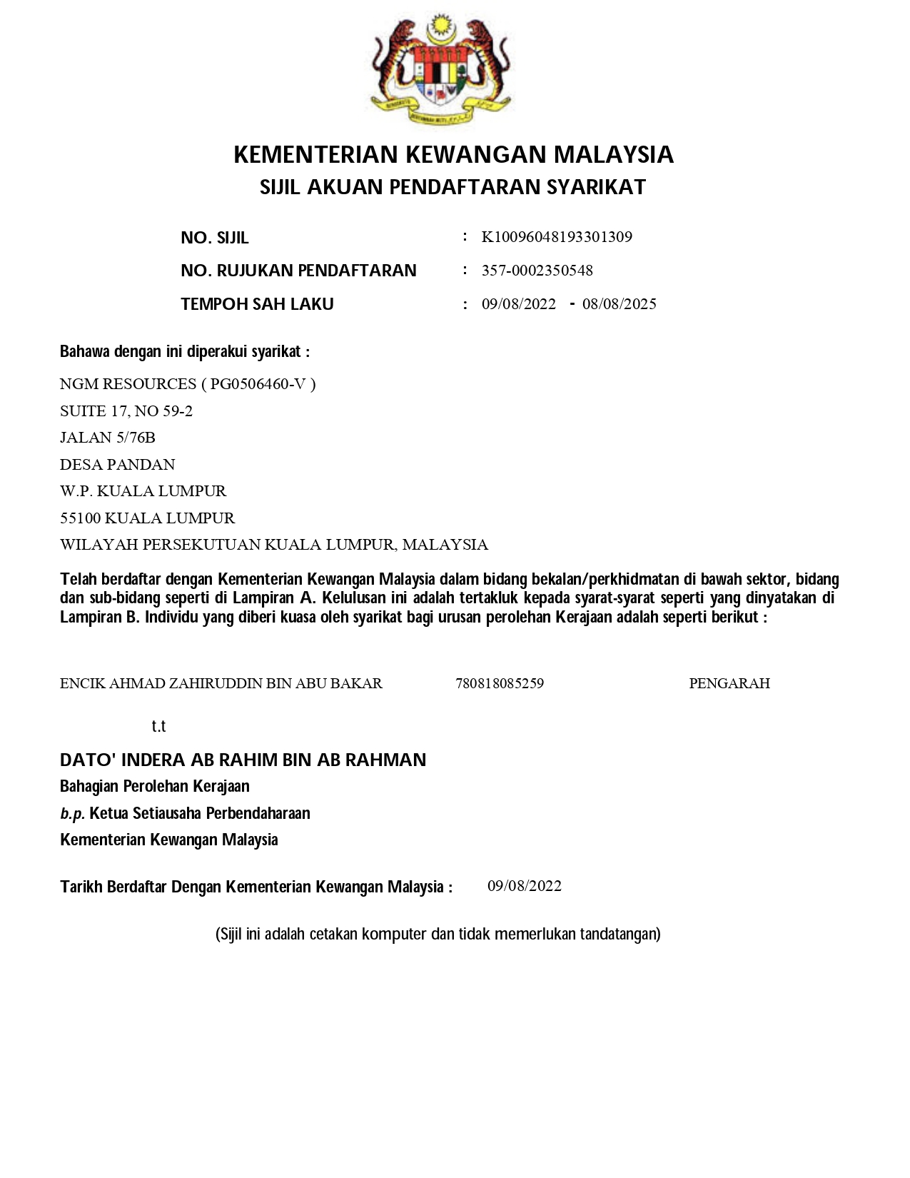 MINISTRY OF FINANCE (MOF) CERTIFICATE